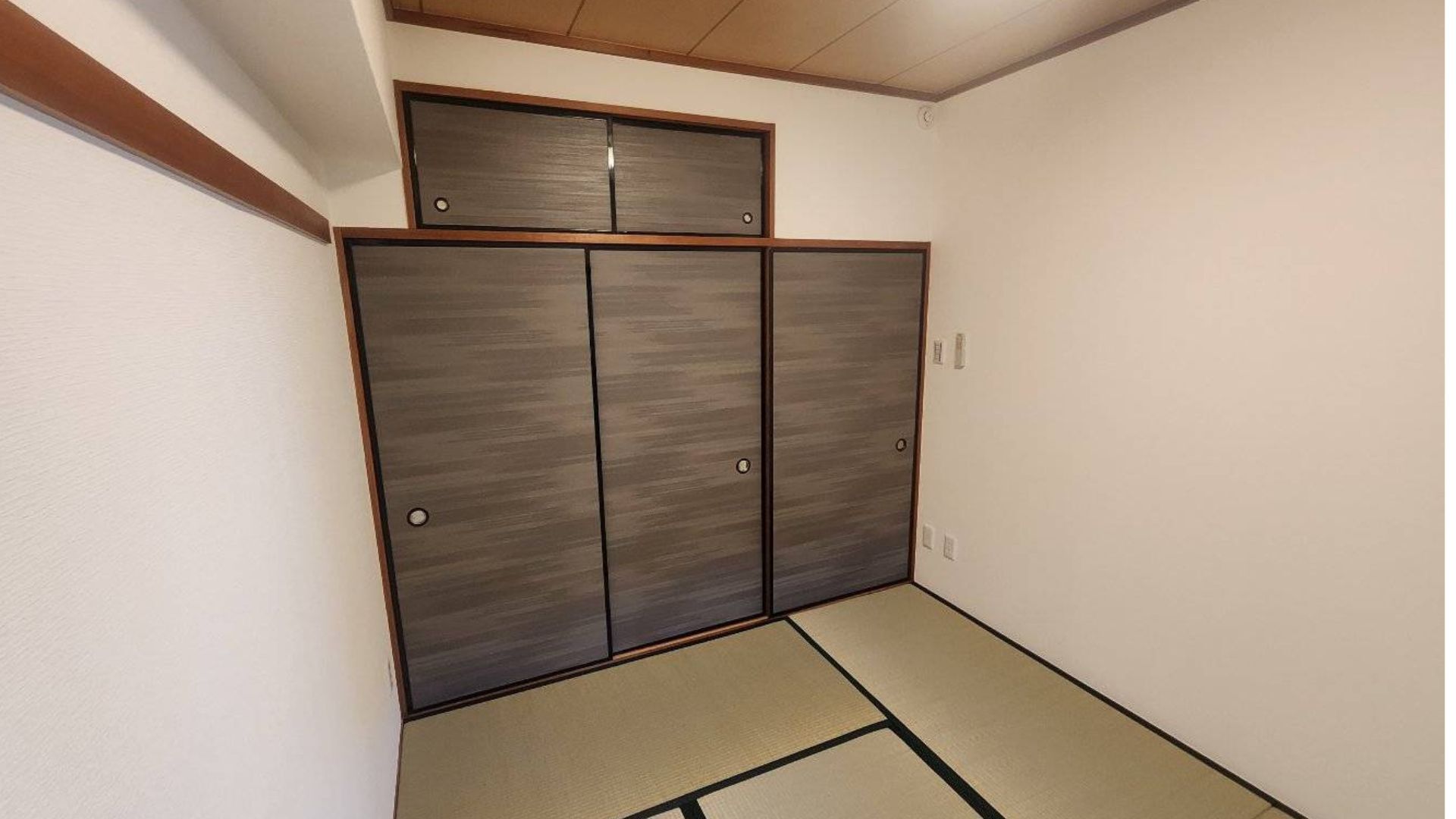 畳はそのまま活かしつつ、襖(ふすま)をシックな木目調のデザインに一新しました。上部の天袋の襖も同様の素材で統一することで、空間全体にまとまりとモダンな雰囲気を創出。壁や天井は現状維持ながらも、襖の交換によってお部屋全体が引き締まり、格段に洗練された印象に変わりました。和の趣と現代的なデザインが融合した、心地よい空間へと生まれ変わっています。