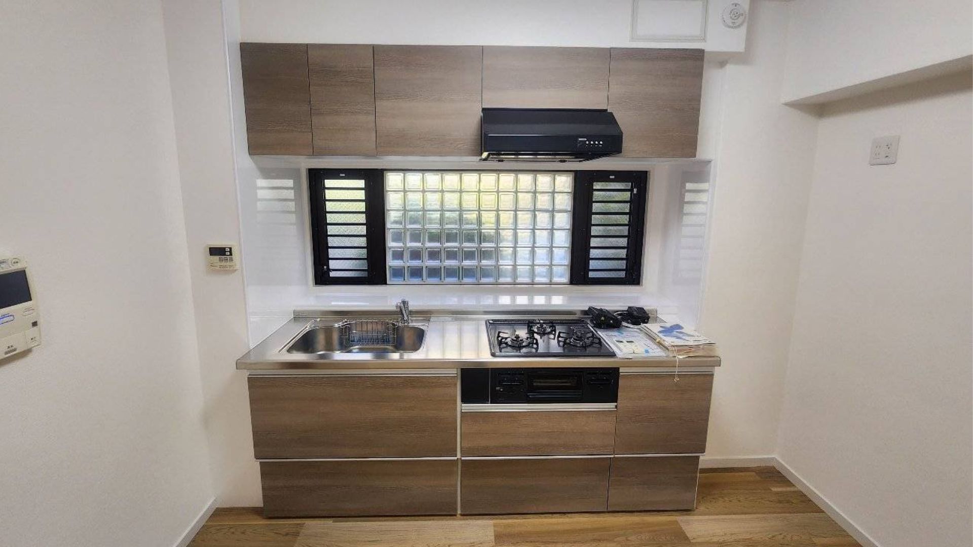 既存のキッチンを撤去し、最新のシステムキッチンを導入しました。扉カラーは温かみのある木目調を採用し、空間全体に明るさと開放感をもたらしています。シンクとコンロ周りは使い勝手を考慮した配置に変更し、広々とした調理スペースを確保。上部には新しいレンジフードを設置し、収納も増設することで、機能性が格段に向上しました。